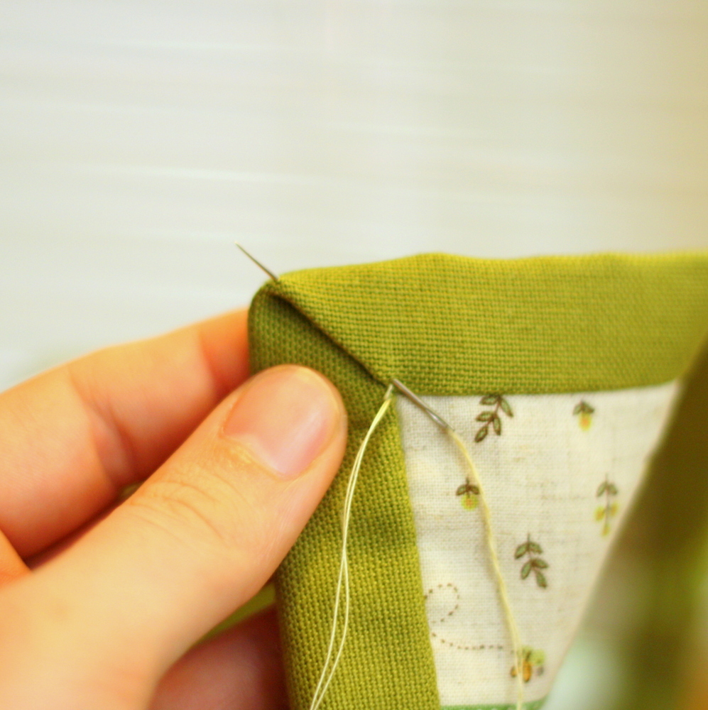 20. Now you just have to fold the binding over and hand-sew the back. Start at the point where the binding begins and ends: